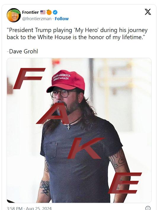 The Foo Fighters lead singer has been a critic of former U.S. President Donald Trump. By : Nur Ibrahim Claim: Authentic photograph shows Foo Fighters singer Dave Grohl wearing a MAGA hat indicating support of former U.S. President Donald Trump. Rating: Fake In August 2024, a photograph of Foo Fighters singer Dave Grohl apparently wearing a MAGA hat — referring to the Trump campaign slogan "Make America Great Again"—indicating his support for former U.S. President Donald Trump, went viral. The photograph appeared on X with this statement attributed to Grohl: "President Trump playing 'My Hero' [referencing a Foo Fighters' song] during his journey back to the White House is the honor of my lifetime." The above photograph is a manipulated image and not an authentic depiction of Grohl at the time. The MAGA hat was edited onto Grohl's head, and Grohl did not say the words attributed to him. Rather, the Foo Fighters representative said the band had not granted permission to the Trump campaign to use their song. As such, we rate this claim as "Fake." Using Google's reverse-image search tool, we traced the photograph back to November 2023. The original image appeared in Australian media in November 2023 and showed Grohl leaving a hotel in Perth, wearing a black cap. PerthNow, a local newspaper, shared the image, crediting photographer Justin Benson-Cooper. According to the news report, Grohl was staying in the Ritz Carlton, ahead of a performance with his band. The lettering on the black cap he was wearing said, "HOPE, The Mission." Grohl can be seen in other photos wearing the same outfit and black cap. Grohl vs. Trump On Aug. 23, 2024, at a Trump rally in Arizona, the Trump campaign used the Foo Fighters song "My Hero" to introduce Robert F. Kennedy Jr. onstage. Kennedy was an erstwhile presidential candidate who dropped out of the race to endorse Trump. But the band was not happy about the use of their song. A representative for the Foo Fighters told Entertainment Weekly, "Foo Fighters were not asked permission, and if they were they would not have granted it. Also any royalties received as a result of this use will be donated to the Harris/Walz campaign." Grohl has been critical of Trump in the past. In a 2018 GQ interview, he said: Listen, who cares what I think about guns or religion, but the thing about Trump that stings the most is this: he just seems like a massive jerk. Right? I know a lot of wonderful people who don't share my politics and you can bet tomorrow night in the stadium not everyone will share the same opinion or hold the same views. But when I sing 'My Hero' they will all sing it with me. In the three hours that I am on stage, none of that matters. The image in question is thus a manipulated version of an older image and the Foo Fighters have disputed the Trump campaign's use of their song. |