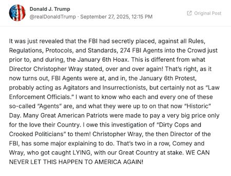 Conservative media outlets suggested undercover federal agents incited the insurrection. U.S. President Donald Trump amplified that claim. By Anna Rascouët-Paz In late September 2025, a rumor began to spread that, contrary to the assertions of former FBI Director Christopher Wray, the federal law enforcement agency had sent agents undercover in the crowd of protesters on Jan. 6, 2021, in Washington, D.C. and the agents then incited the violence that resulted in the U.S. Capitol riot. For example, a Sept. 25 X post (archived) claimed "275 undercover agents" were in the crowd of Jan. 6 rioters: The claim appeared elsewhere on X as well as on Reddit. Further, Snopes readers emailed asking to confirm whether the rumor was true. The claim was not new. Snopes identified posts from 2024 making the same claim. This rumor circulated widely in an attempt to find attenuating circumstances for Jan. 6 rioters convicted of crimes, including trespassing, assaulting police officers and seditious conspiracy. This time, however, the rumor stemmed from reports by conservative news outlets The Blaze and Just the News, both published on Sept. 25, 2025. Citing one anonymous congressional source, The Blaze said the FBI had admitted to sending "274 plainclothes agents" in the Jan. 6 crowd. It also reported that 26 FBI informants also joined the crowd, four of whom entered the Capitol. Just the News linked to an "after-action report" it said it had obtained and also reported that 274 agents were in the crowd. The reports appeared to suggest that the long-standing rumor that undercover FBI agents had incited the violence was true. Two days later, on Sept. 27, President Donald Trump relayed the claim on Truth Social, in a post that has since been deleted (archived): Attachment 2577064 In the post, Trump called Jan. 6 a hoax. He also said these claims directly contradicted Wray's testimony. After Jan. 6, 2021, a House subcommittee on Jan. 6 began to conduct an investigation. This subcommittee disbanded in January 2023 after 18 months of work. However, in early September 2025 the House voted to open a new subcommittee chaired by Rep. Barry Loudermilk, a Republican from Georgia, to reinvestigate the matter, including the conclusions of the first subcommittee. The new subcommittee included Democrats. Snopes reviewed the after-action report published by Just the News, which did not support the claims in the outlet's story. We could not identify who The Blaze's anonymous source was, therefore we could not confirm its report. We have contacted both the FBI and the new House subcommittee and we will update this report should they respond. However, we found a Sept. 26, 2025, post on X (archived) by the new subcommittee on Jan. 6, which included the apparent screen capture of a spreadsheet: The row concerning the deployment of FBI agents during Jan. 6 read: Deployment date: 1/6/2021 Position type: Agents Event: 1/6 incident Field Office/HQ Division: WFO [Washington Field Office] Total Personnel Count: 274 Notes: This number includes agents that responded to the Capitol grounds as well as inside the Capitol, the pipe bombs, and the red truck that was believed to contain explosive devices as well as CDC/ADCS. While the number matched the reports by The Blaze and Just the News, the notes did not corroborate the claim that the FBI agents were undercover. While the exact number of FBI agents deployed had not been publicly reported before, the allegations that the FBI and its former director, Wray, had attempted to keep it secret did not hold up, either. For example, a December 2024 report by the Department of Justice's Office of the Inspector General acknowledged that in light of the intelligence the FBI was gathering on the Jan. 6 protest, "hundreds of highly trained specialized teams" would "be meeting DC." It falls under the FBI's responsibility to support a law enforcement response for crowd control should the circumstances call for it, as this DOJ report explained. However, the same report said the investigation had revealed no proof this had been the case. "We found no evidence in the materials we reviewed or the testimony we received showing or suggesting that the FBI had undercover employees in the various protest crowds, or at the Capitol, on January 6," the report said. Instead, the FBI deployed agents after the riot began. The report read: Indeed, after the Capitol was breached by rioters on January 6, the FBI was in a position to deploy tactical assets to help clear the Capitol of protesters and to help USCP secure the perimeter around the Capitol Complex. The FBI told Congress that its posture for January 6 preparations was "extraordinary," and we found that the FBI effectively carried out its tactical support function on January 6. Citing the DOJ report, The Blaze's story included one sentence that appeared to seed doubt. "Depending how one reads 'undercover' agents versus 'plainclothes agents,' both statements could be true," it read. It is important to note that most FBI agents do not wear uniforms in the field, unlike local law enforcement. Instead, most wear civilian clothes, except for tactical teams, who instead may wear tactical gear. As a rule, the dress code is business casual. The Blaze's and Just the News' reports did not cite "undercover" agents, but plainclothes agents, which is consistent with FBI standards for dress. In sum, despite suggestions by these two news outlets and the now-deleted post by Trump, there was no evidence that the FBI agents deployed on Jan. 6 were undercover. We could not independently confirm the number, though it is in line with the DOJ report published in December 2024. |
