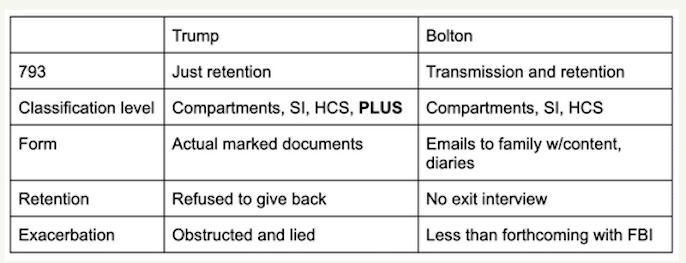 The John Bolton indictment is a substantive document. If the claims about classification levels stand up, it is as substantive as the indictment against Trump (though with less sensitive documents and none of the obstruction). By emptywheel For each of 8 charged documents (each was charged twice, once for transmission and once for retention) it describes Bolton sending the information to one of his family members via an AOL account that got hacked by Iran, then keeping it such that it was found when the FBI searched his house earlier this year. Importantly, none of these are marked classified documents, like Trump’s stolen documents were. They are his excerpts. So there will be an enormous contest over the classification determinations, especially since Kash and John Ratcliffe were involved. There are ten charged retained documents (that is, the same 8, plus two more). The latter two may be marked — they may be the old Iraq documents Bolton referred to. The indictment describes someone — presumably from Iran — attempting to blackmail Bolton (at which point he told the FBI that he had been hacked). It also quotes Bolton mocking Pete Hegseth for sharing classified information on Signal. There are defenses to this case (including that Trump won’t prosecute Hegseth). But it is a solid case. Update: Bolton is quoting referring to “diaries” throughout this indictment. One of the FBI Agents on this case reportedly was involved in the Joe Biden case. In that case, Biden fairly argued that DOJ was applying a different standard to him than DOJ had applied to Reagan in Iran-Contra. It’s Hur’s analysis of Biden’s diaries that I find most interesting, and troubling. Hur’s approach to these diaries is one of the most obvious flags of political bias in a report full of them. Take his use of language. The word “diaries” appears 103 times in the report [note: someone with interns should replicate this work, as it is inexact]. In about five of those instances, Hur quotes the people around Biden referring to these notebooks as diaries. Two instances discuss the Presidential Record Act’s language treating diaries as personal records, exempt from PRA. Maybe ten or so appear in a section where Hur envisions that Biden would describe these as diaries as a defense, but the word is always put in Biden’s mouth. Hur adheres to using “notebooks” here. Mr. Biden will likely say, he never believed his notebooks, which he thought of as his personal diaries, fell within that arrangement. He treated the notebooks markedly differently from the rest of his notes and other presidential records throughout his vice presidency, for example, allowing staff to store and review his notecards, but not his notebooks. 914 This treatment, he will argue, and the extremely personal content of some of the notebooks, shows that he considered them to be his personal property. Mr. Biden’s notebooks included gut-wrenching passages about his son’s death and other highly personal material. 915 His claim that he believed he did not need to send what he considered to be his personal diary to be stored at a government facility will likely appeal to some jurors. 916 We expect Mr. Biden also to contend that the presence of classified information in what he viewed as his diary did not change his thinking. As a member of the exclusive club of former presidents and vice presidents, Mr. Biden will claim that he knew such officials kept diaries, and he knew or expected that those diaries-like Mr. Reagan’s-contained classified information. 917 He also understood that former presidents and vice presidents took their diaries home upon leaving office, without being investigated or prosecuted for it. [all emphasis mine] But the overwhelming bulk of those remaining 85 or so uses of the word “diaries” describe Reagan’s (or in two cases, other Presidents’) diaries. By contrast, there are 461 uses of the word “notebook” in Hur’s report. That’s the word Hur uses to refer to what he quotes people around Biden calling the President’s diaries. Reagan had diaries. And as a result, when DOJ discovered them, they remained untouched. Biden has notebooks. By calling these notebooks, Hur permitted himself to do with Biden’s most private thoughts what DOJ did not do with Reagan’s: review them all. Mr. Biden’s notebooks, which contained, among other things, his handwritten notes taken during classified meetings as vice president, presented a challenge. None of the pages contained classification markings but investigators assessed some of the content was potentially classified. Classification review by intelligence agencies of unmarked information is more challenging and time-consuming than for marked documents. We therefore reviewed all of Mr. Biden’s handwritten notes and selected thirty-seven excerpts totaling 109 notebook pages to submit for classification review. Investigators selected entries they believed were most likely highly classified and that a jury of laypeople would find was national defense information under the Espionage Act. [my emphasis] I assume Bolton will make a similar argument. Update: Because people are asking, here’s a really rough comparison of Bolton’s indictment with Trump’s. Attachment 2583076 |
