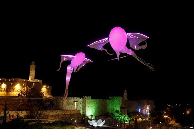 Hình ảnh ấn tượng nhất trong ngày 6/6 là 2 chú cá bay trên bầu trời trong lễ hội ánh sáng ở Israel.