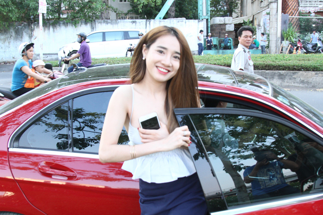 Phía sau hậu trường một sự kiện, Angela Phương Trinh cũng nhanh tay kéo váy cúp ngực lên cao.