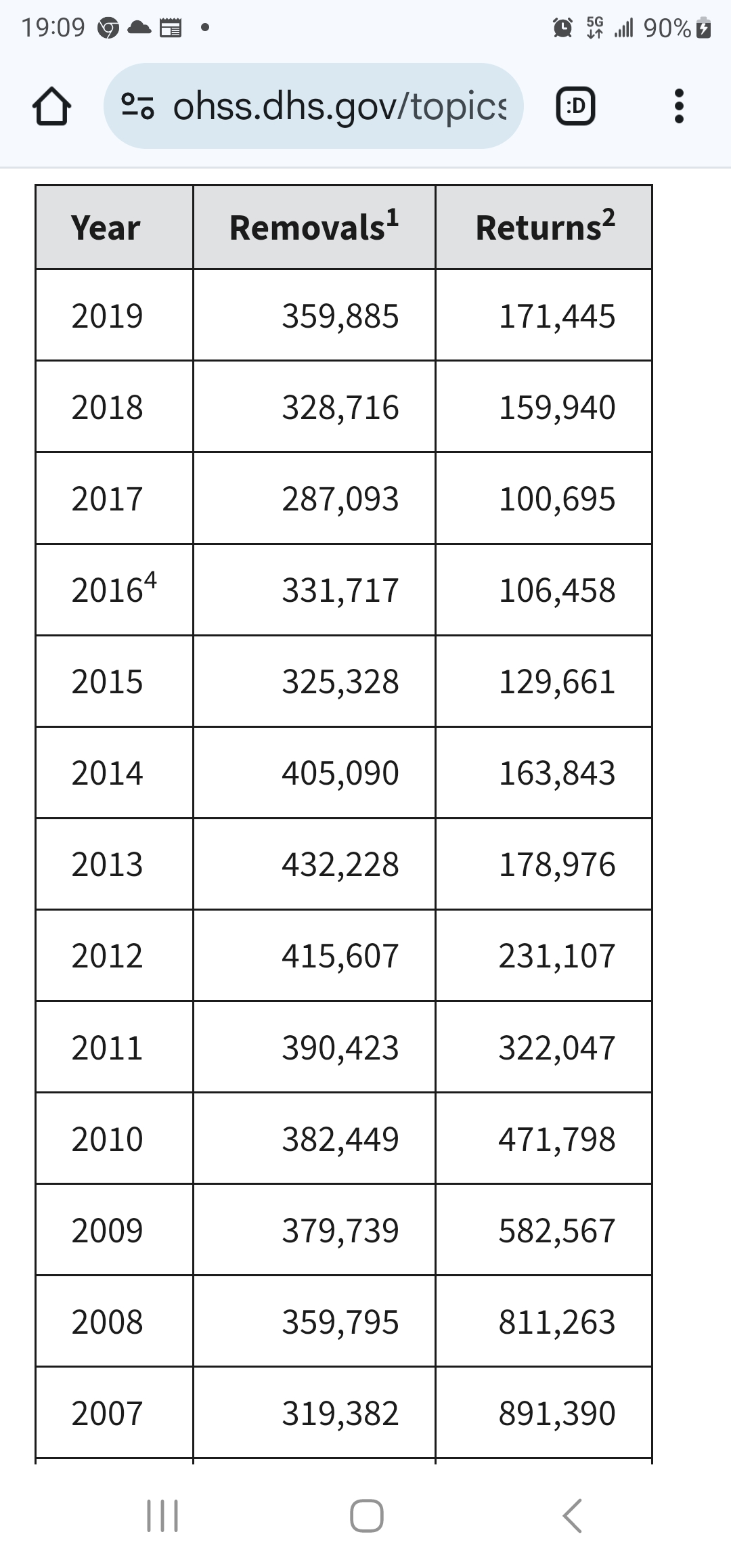 xem bảng thống kê để biết rõ số di dân bị trục xuất và trở lại theo năm