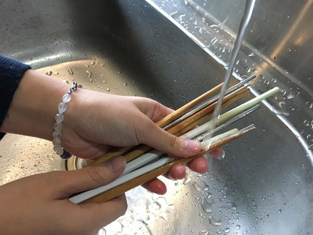 - Vệ sinh: Ăn xong phải rửa đũa ngay, rửa chậm rãi, cẩn thận. Ngô An Hoa cho biết, khi rửa đũa, nên nhỏ một ít chất tẩy rửa vào khăn mềm, chà xát từng chiếc một, có thể giảm ma sát, giúp đũa sạch hơn. Đũa nhúng vào chất tẩy rửa phải được rửa sạch từng chiếc một dưới vòi nước chảy, không bao giờ được chà cả bó đũa trong nước.
