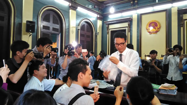 Luật sư hướng dẫn Lữ Minh Nghĩa giao nộp chứng cứ cho HĐXX.