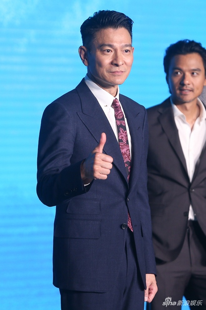 Lưu Đức Hoa hào hứng chạy lên sân khấu khi MC nhắc tới tên ḿnh trong buổi họp báo quảng bá phim Phi vụ cuối cùng.