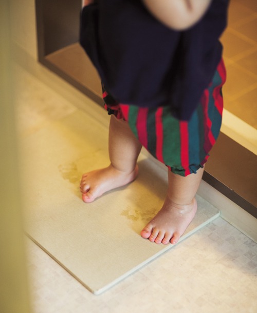 Ở khu vực phòng tắm, thảm chùi chân đặt trước cửa làm từ đất tảo cát. Đôi chân dù có ướt đến mấy khi cũng khô cong khi đặt lên tấm thảm này nên Kaori không tốn công giặt giũ. Chủ nhà cũng không mua khăn tắm mà chỉ chuẩn bị sẵn vài cái khăn mặt để lau người.