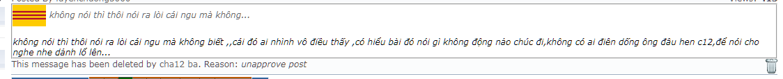 Đã Đến Lúc Phải Nói Sự Thật 08-03-2020 11:50 florida80 Ông deleted post của tbtb nữa .. Rồi xóa hết giấu vết ..{ ném đá giấu tay đổ thừa cho cha12 ba hèn hạ }