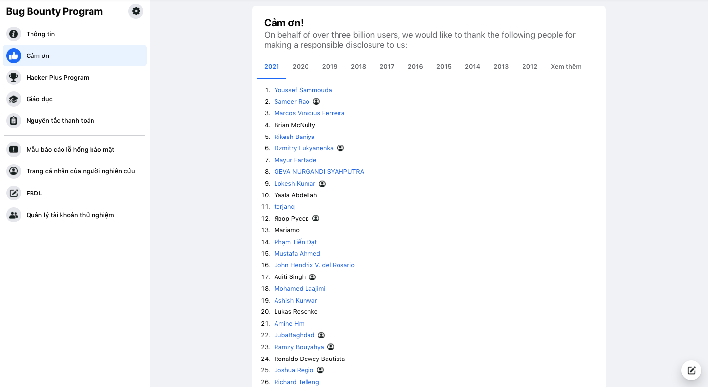 Những năm gần đây các hacker mũ trắng của Việt Nam liên tục được Facebook gửi lời cảm ơn vì đã đóng góp công sức nhằm tăng tính bảo mật của hệ thống này. Ở các năm 2018, 2019 đã có 4 hacker Việt Nam được Facebook vinh danh, 2020 là 7 người và tới năm nay là tới 9 người.