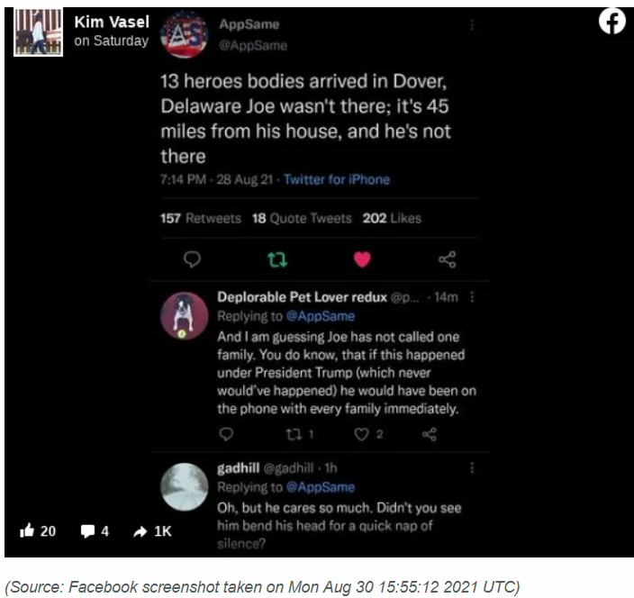 Did President Joe Biden not go to Dover Air Force Base (AFB) on August 29, 2021, to attend the dignified transfer of the remains of service members killed in a suicide bombing at Kabul airport in Afghanistan? No, that's not true: A spokesperson from Mortuary Affairs at Dover AFB told Lead Stories that "President Biden was here" for the transfer ceremony. Many news outlets in the U.S. and elsewhere reported on both the president and first lady attending the service.