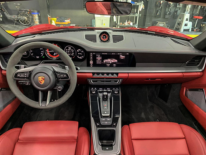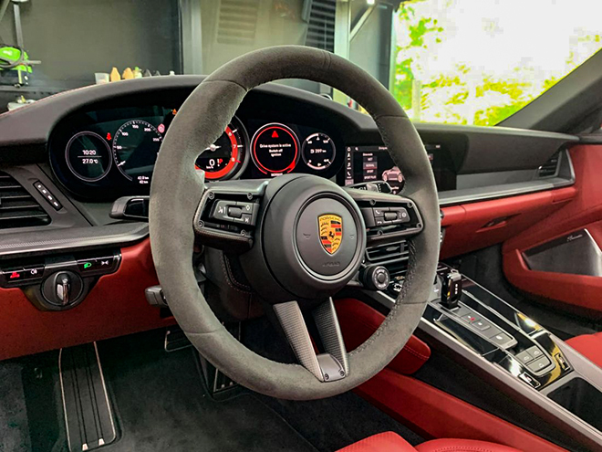 Nội thất được ốp sợi carbon mờ ở bảng điều khiển trung tâm và bảng táp lô trị giá 116,1 triệu đồng, bệ cửa ốp sợi carbon với logo 911 phát sáng giá 65,8 triệu đồng. Việc tùy chọn thêm logo Porsche dập ch́m trên tựa đầu cũng tốn của chủ xe thêm 14,7 triệu đồng, trụ lái bọc da cao cấp tốn 23,2 triệu đồng, mặt đồng hồ ṿng tua và đồng hồ Chrono sơn đỏ, giá tổng cộng 44,8 triệu đồng, ghế sưởi và làm mát tốn thêm hơn 100 triệu.
