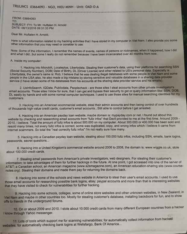 H́nh ảnh của bức thư Hiếu PC tự công khai thông tin với công tố viên Mr. Arnold vào năm 2016