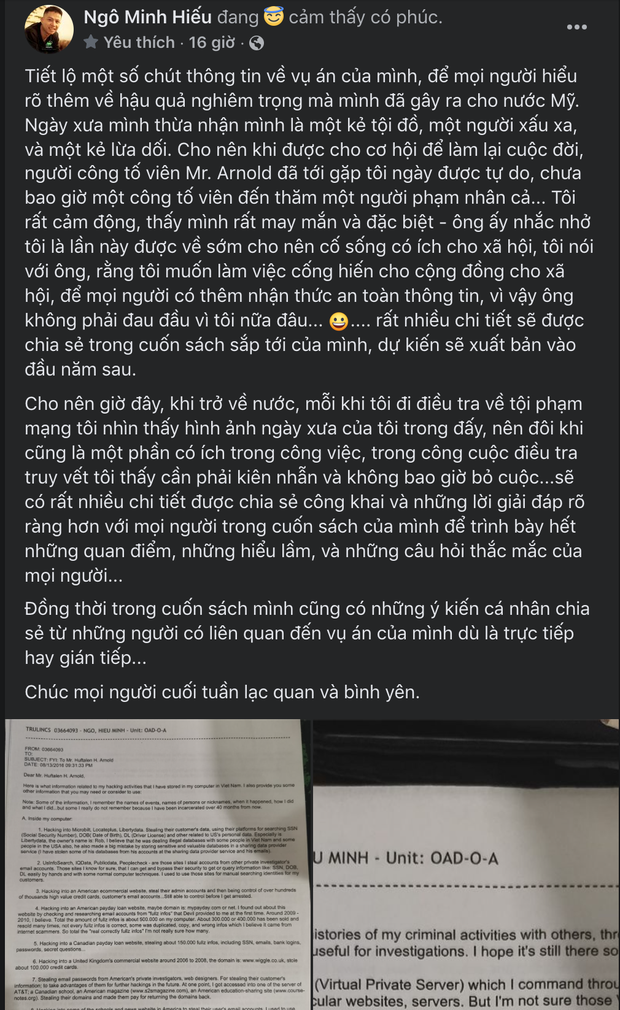 Mới đây trên Facebook cá nhân của ḿnh, Hiếu PC lần đầu tiên chia sẻ thêm một số thông tin về vụ án của anh tại Mỹ. Nhiều người theo dơi của Hiếu PC khá bất ngờ khi anh đă có thể cởi mở hơn để chia sẻ đến vụ án của ḿnh.