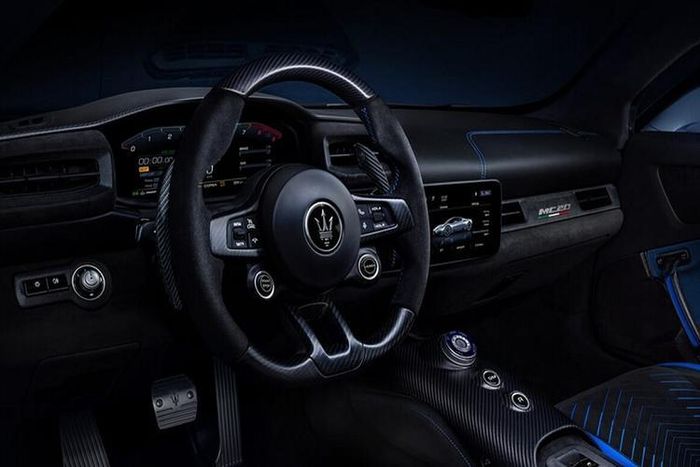 Bên trong khoang lái của siêu xe Maserati MC20 chỉ có da cao cấp, sợi carbon, nhựa và kim loại để mang đến nội thất tối giản nhất so với các dòng xe Maserati khác. Xe có màn hinh giải trí vừa đủ, bảng đồng hồ thể thao và bảng điều khiển trung tâm kéo dài, chia đôi ghế lái cùng ghế phụ.
