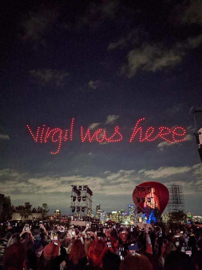 Trên bầu trời đêm, những ánh sáng màu đỏ làm bật lên câu nói quen thuộc của nhà thiết kế quá cố: "Virgil đã ở đây".