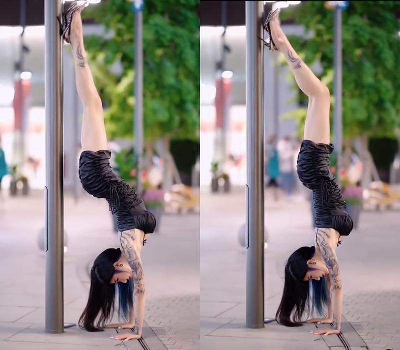 Người đẹp trong video nổi bật với vóc dáng mảnh mai cùng những hình xăm ấn tượng trên cơ thể. Chẳng những gây ấn tượng với màn trồng cây chuối ngoạn mục cô còn được khen cho lựa chọn phục trang tôn dáng.