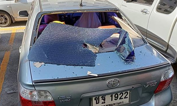 Sức ép từ vụ nổ khiến kính sau của ôtô vỡ tung, có mảnh văng xa vài mét, hôm 23/4 ở Bang Sao Thong, tỉnh Samut Prakan.
