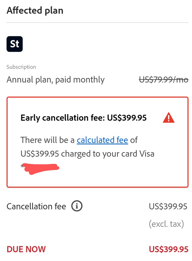 Khách hàng đăng ký dùng thử miễn phí sau đó bị tính phí và tự động chuyển sang gói Creative Cloud mặc định, vốn là một hợp đồng hằng năm. Để hủy hợp đồng này, người dùng phải trả một khoản phí bằng 50% giá trị "số tiền hợp đồng còn lại" mặc dù dịch vụ sẽ kết thúc ngay trong tháng đó.