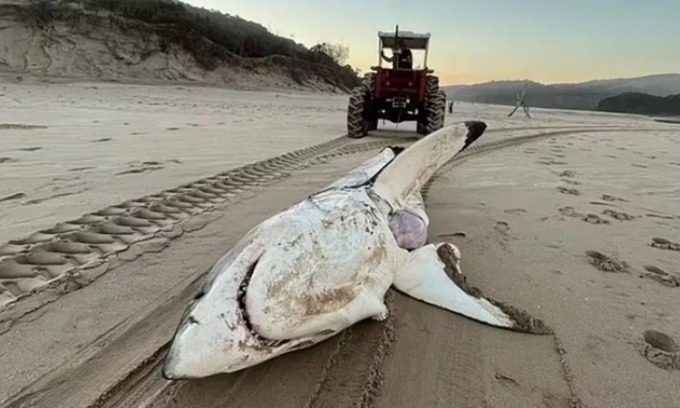 Các nhà khoa học kết luận sau khi khám nghiệm xác cá mập trắng mắc cạn ở tỉnh Đông Cape, Nam Phi. Kevin Cole ở Bảo tàng Đông London cộng tác với Alison Towner ở Đại học Rhodes, tiến hành khám nghiệm.