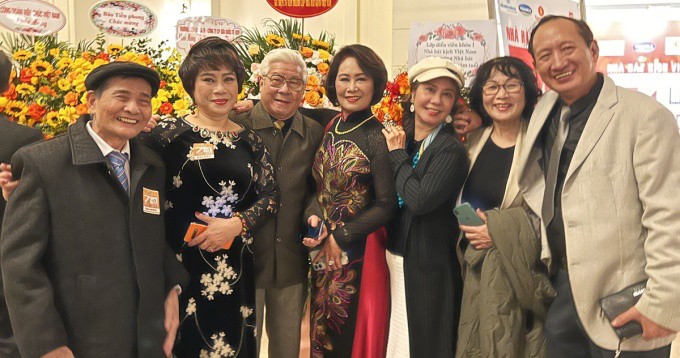 Nghệ sĩ Hữu Độ (thứ ba từ trái sang) hội ngộ bên các đồng nghiệp hồi tháng 11/2022, dịp nghệ sĩ Xuân Bắc nhận Huân chương lao động. Ảnh: Hiểu Nhân