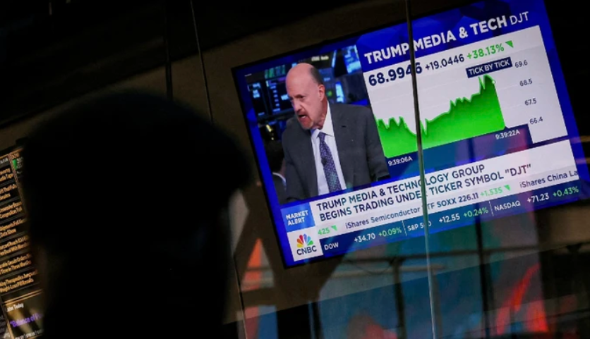 Màn h́nh hiển thị thông tin giao dịch về cổ phiếu của Truth Social và Trump Media & Technology Group. Ảnh: REUTERS