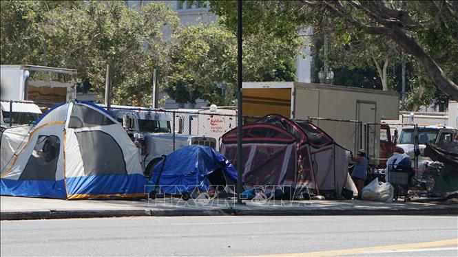 Lều trại của người vô gia cư ở trên vỉa hè tại California, Mỹ. Ảnh: THX/TTXVN