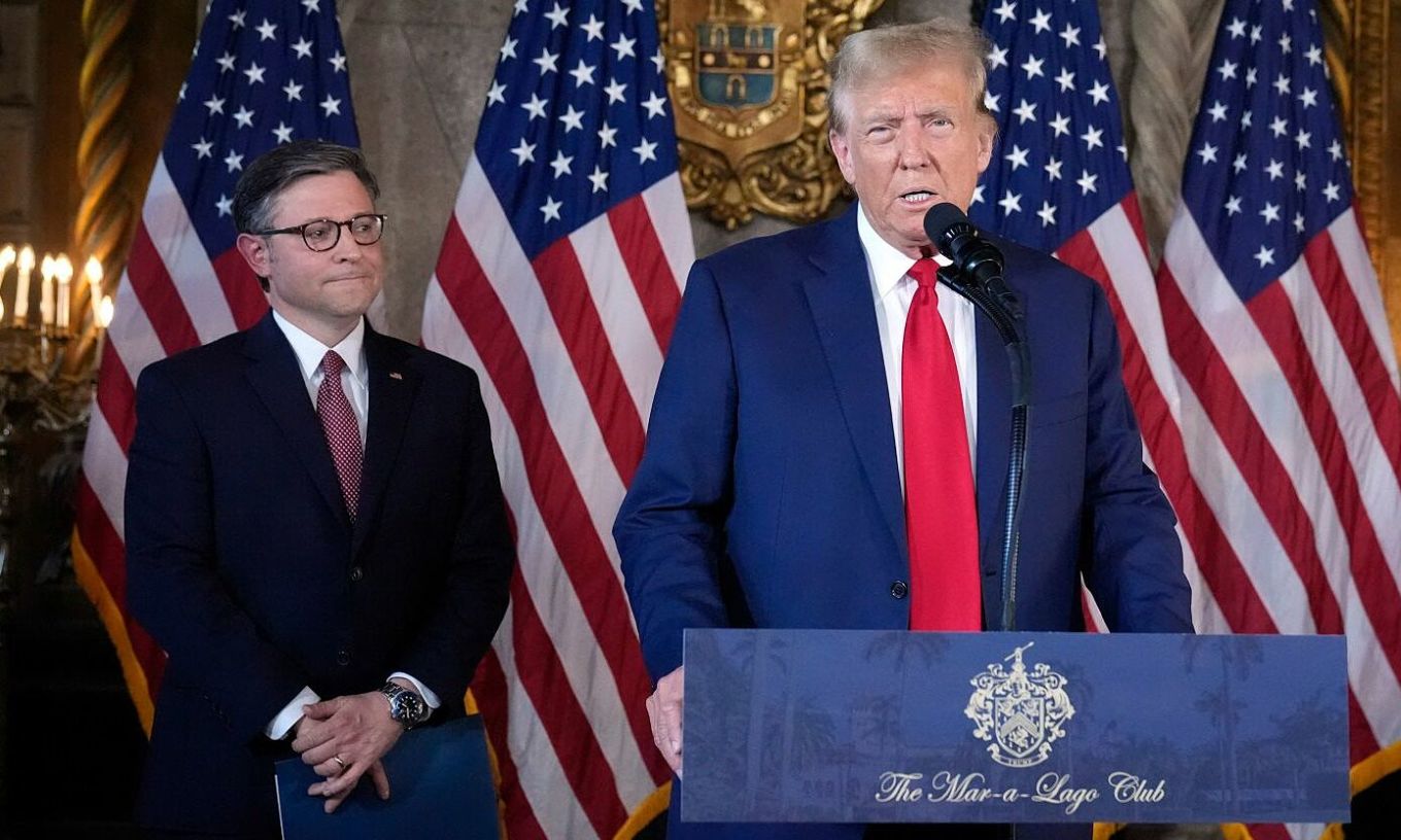 Ông Donald Trump (phải) và Chủ tịch Hạ viện Mike Johnson trong cuộc họp báo ở Mar-a-Lago, Palm Beach, bang Florida hồi tháng 4/2024. Ảnh: AP