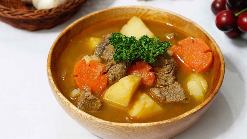 Khi thịt bò đã mềm, bạn cho cà rốt và khoai tây vào nồi, tiếp tục ninh cho đến khi rau củ chín mềm. Thêm hành tây vào sau cùng, nêm lại gia vị cho vừa ăn. Để tạo thêm độ sánh cho món ăn, bạn thêm 1-2 thìa bột sắn dây pha sẵn vào nồi khuấy đều, đun sôi thêm 3 phút là được.