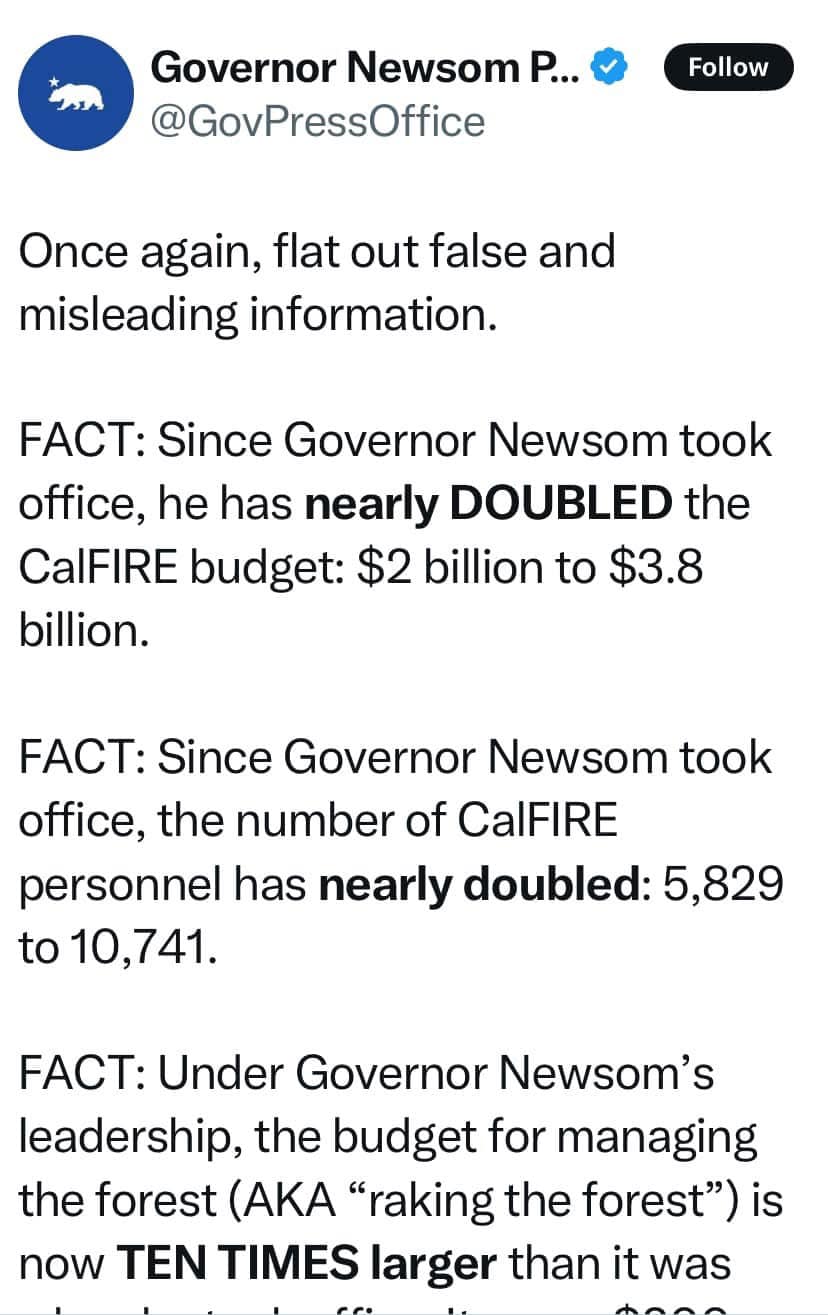 Báo chí nói Newsom cắt ngân sách chữa lửa 80%. Newsom nói báo chí nói láo vì trong thời Newsom, cả ngân sách cũng như lực lượng chữa lửa đều tăng . Dân đen dốt nên không hiểu chuyện tăng giảm nhưng nhìn con số thì thấy đi xuống.