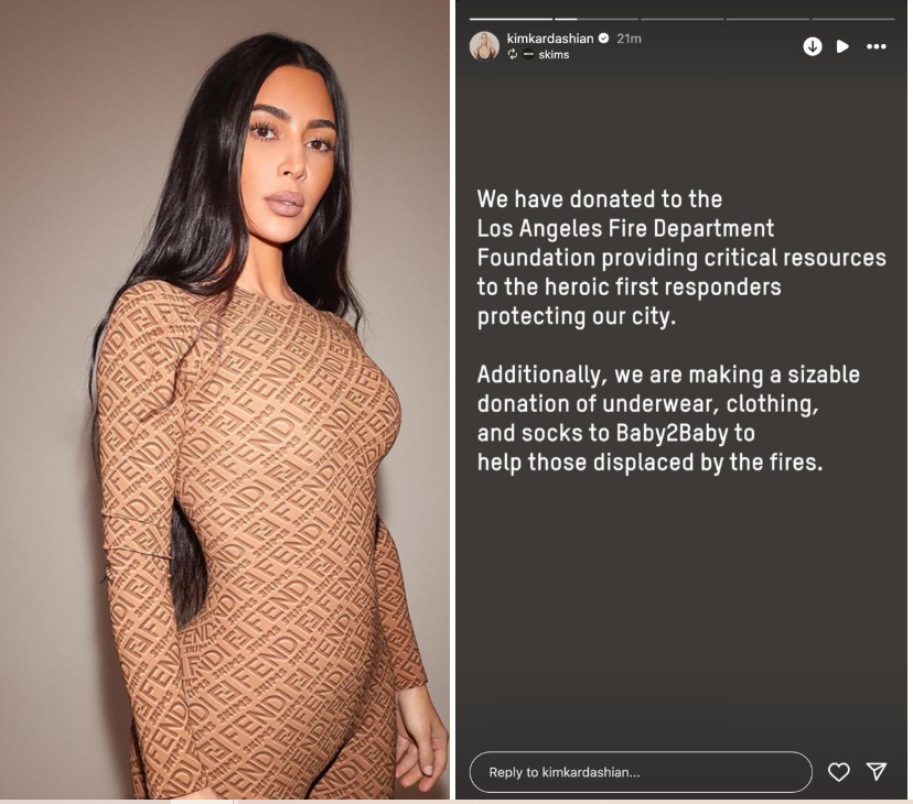 Thông báo của Kim được đưa ra sau khi thương hiệu do cô sáng lập, Skims, bị chỉ trích “thiếu nhạy cảm” vì quảng cáo sản phẩm thời trang trong thời điểm cháy rừng bùng phát tại khu dân cư cao cấp Pacific Palisades vào đêm 7/1.