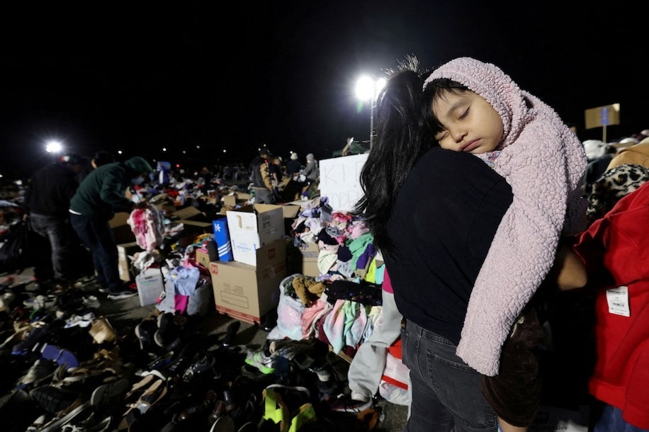 Bé gái ngủ trên vai mẹ trong một điểm phân phối hàng cứu trợ cho nạn nhân đám cháy Eaton tại công viên Santa Anita ở Arcadia, bang California, ngày 11/1. Ảnh: Reuters