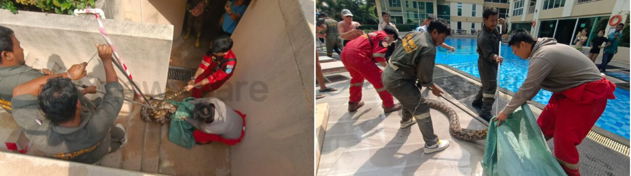 Những hình ảnh được ghi lại từ hiện trường cho thấy các nhân viên chuyên nghiệp đã vật lộn với con vật khổng lồ lẩn trốn trong tường. Họ phải dùng búa đập vỡ bức tường để kéo con trăn ra ngoài.