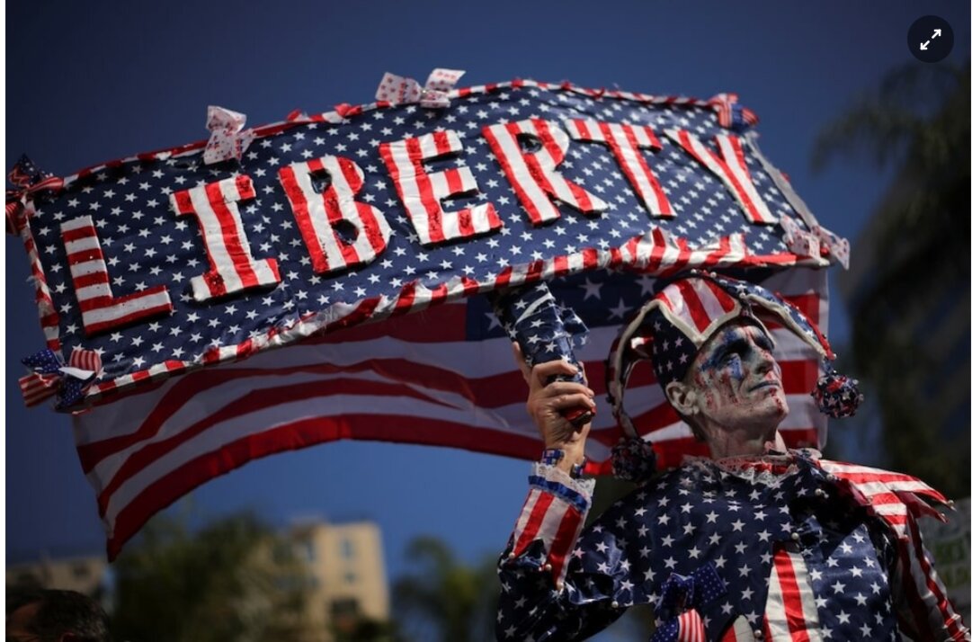 Ông Dan Didi hóa trang để tham gia cuộc biểu tình vào ngày 5/4 ở Los Angeles. Ảnh: Reuters.