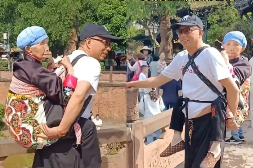 Giữa dòng người tấp nập ở danh thắng Hoàng Long (Tứ Xuyên, Trung Quốc) có hình ảnh làm lay động lòng người. Một người đàn ông hơn 50 tuổi địu mẹ già 92 tuổi trên lưng. Người mẹ an tâm tựa vào vai con trai. Hai người cười nói vui vẻ.