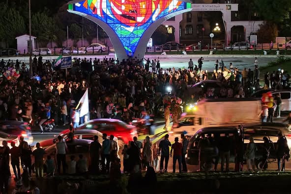 Người dân Syria đổ ra đường ăn mừng tại quảng trường Omeyyad của Damascus sau quyết định dỡ bỏ lệnh trừng phạt đối với Syria của Tổng thống Hoa Kỳ Donald Trump được công bố tại Diễn đàn Đầu tư Mỹ- Saudi Arabia 2025 vào hôm nay 13/5/2025 ở Riyadh.