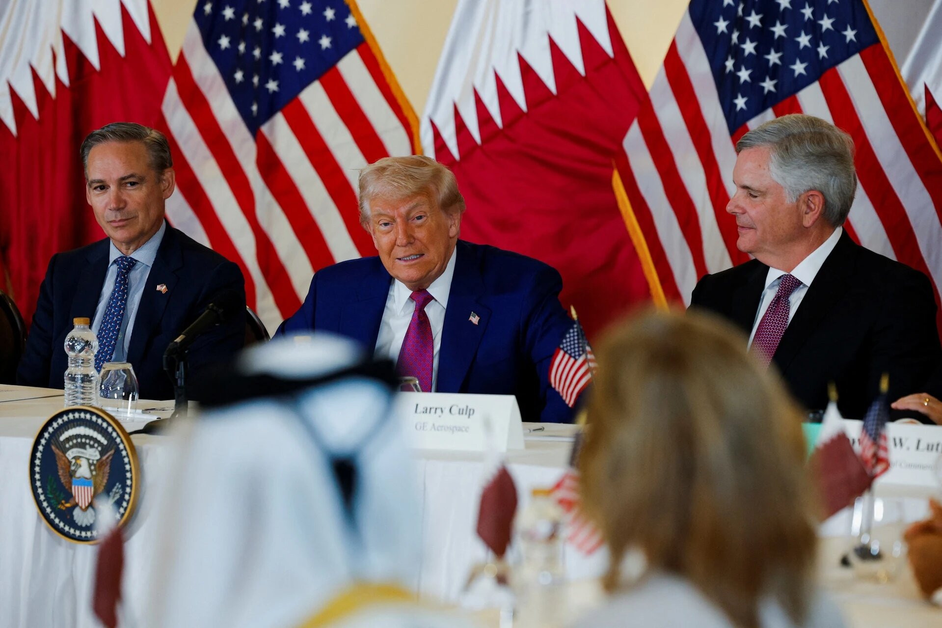 Chủ tịch kiêm CEO Boeing Kelly Ortberg, Tổng thống Mỹ Donald Trump và Chủ tịch kiêm CEO GE Aerospace Larry Culp tham dự một cuộc thảo luận bàn tròn tại Doha (Qatar) ngày 15/5. (Ảnh: Reuters)