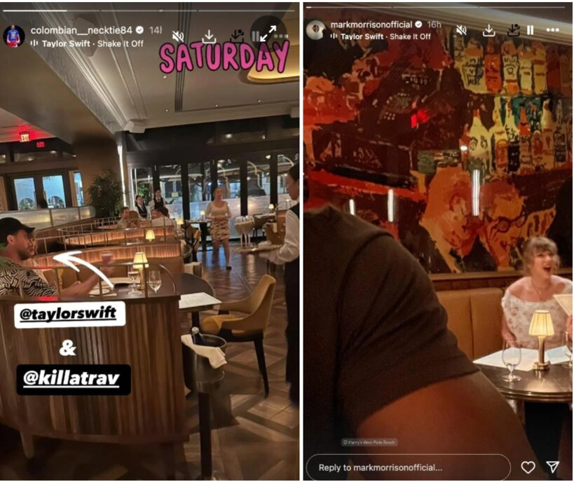 Ngày 24/5, Page Six đưa tin Taylor Swift và Travis Kelce vừa có một buổi hẹn hò riêng tư tại Florida. Cặp đôi bị bắt gặp dùng bữa tối tại một nhà hàng ở West Palm Beach. Trong bức ảnh lan truyền trên mạng xã hội, giọng ca Cruel Summer và bạn trai ngồi sát nhau trong một góc dãy ghế, vui vẻ thưởng thức đồ uống trước khi món chính được phục vụ. Một khoảnh khắc khác được ghi lại cho thấy Taylor tỏ ra phấn khích khi đang dùng bữa tối thân mật.