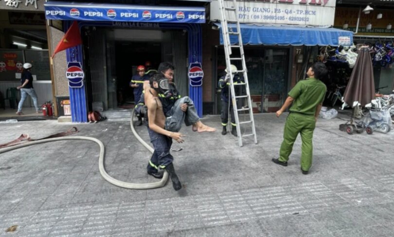 Lửa bùng lên dữ dội tại quán lẩu gà tại căn nhà 6 tầng, rộng gần 400 m² ở Quận 6, cảnh sát kịp thời cứu được 3 người và hướng dẫn 4 người khác ra ngoài an toàn.
