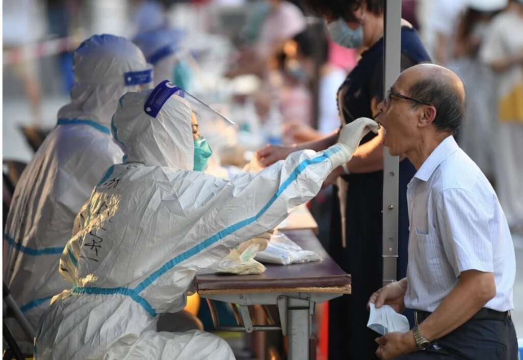 Nhân viên y tế lấy mẫu xét nghiệm COVID-19 cho người dân tại tỉnh Quảng Đông, Trung Quốc. (Ảnh: THX/TTXVN)