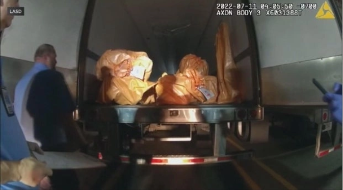 Hình ảnh từ bodycam của cảnh sát cho thấy thùng xe tải chở các túi đựng trang sức sau vụ trộm. Ảnh: LASD