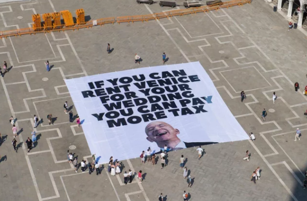 Hôm 23/6, nhóm chống giới tỉ phú Anh “Everyone Hates Elon” (Ai cũng ghét Elon), phối hợp với Greenpeace Italy, đã trải một tấm biểu ngữ khổng lồ trên nền đá ở Quảng trường St. Mark. Trên biểu ngữ có dòng chữ: “Nếu anh có thể thuê Venice cho đám cưới của mình, thì anh cũng có thể đóng thuế nhiều hơn”, kèm theo hình ảnh tỉ phú đang cười lớn.