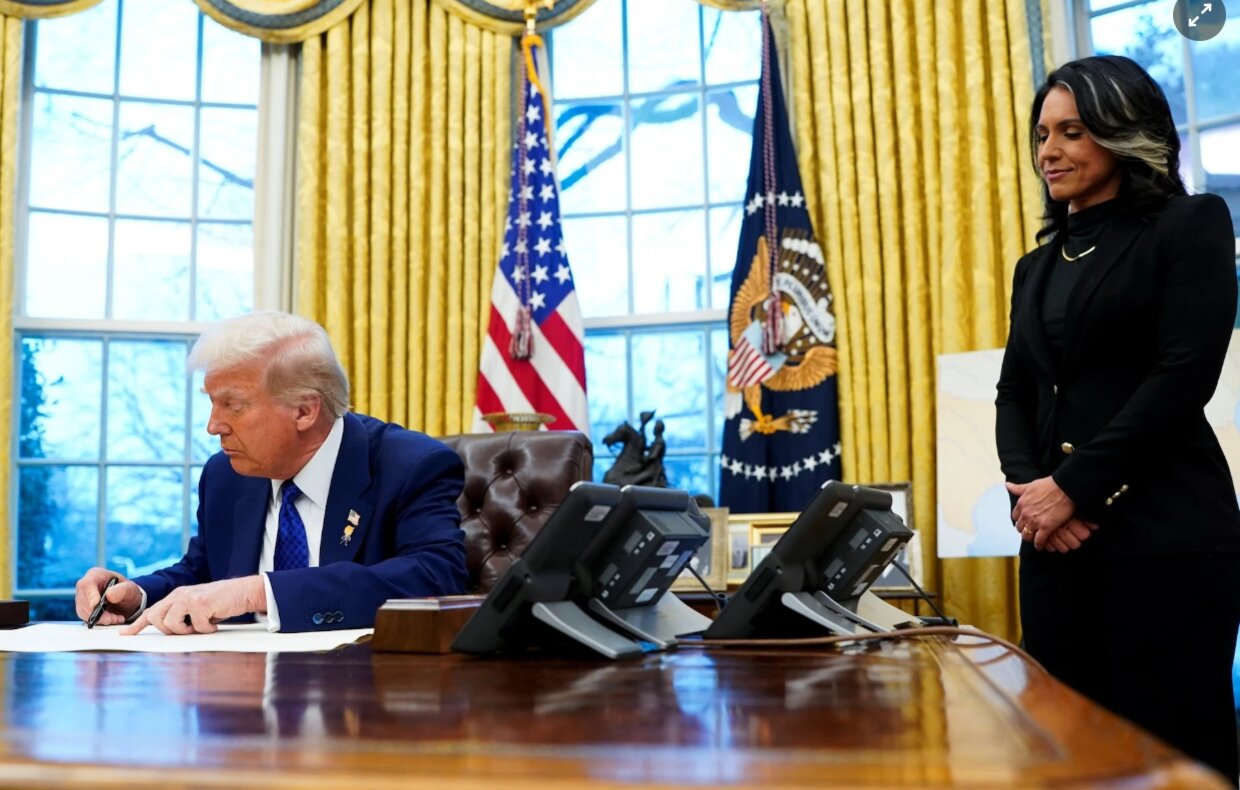 Tổng thống Trump ký một văn bản khi bà Tulsi Gabbard đứng cạnh.