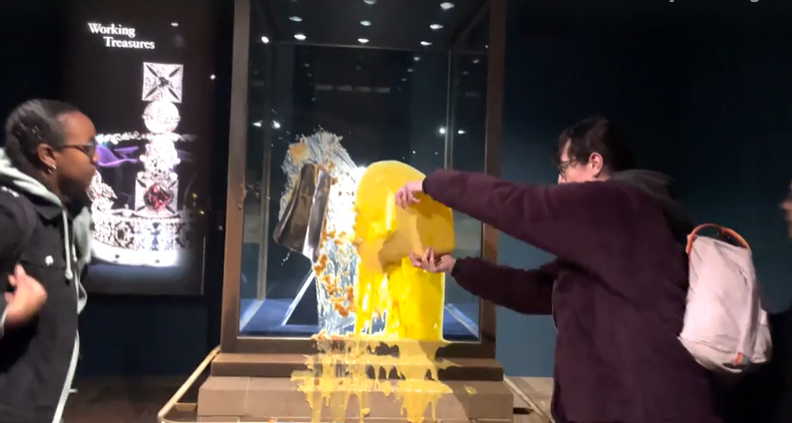 Nhóm cũng đăng video về sự việc lên tài khoản mạng xã hội X. Trong video, họ phá hoại tủ trưng bày trước sự chứng kiến của du khách, đồng thời chỉ trích nền dân chủ. "Nền dân chủ đã sụp đổ", người phụ nữ trẻ hét lên, trong khi người đàn ông ném kem trứng nói rằng "nước Anh đổ vỡ rồi" và "chúng tôi đến để giành lại quyền lực".