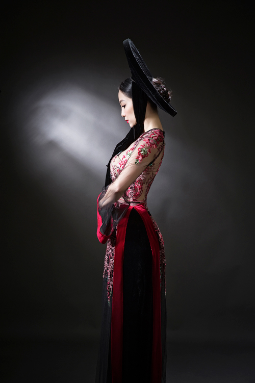Linh Nga làm nàng thơ trong bộ sưu tập áo dài ‘Non thiêng’ của nhà thiết kế Đức Hùng. Hai chất liệu chủ đạo nhung the và lưới mỏng cùng các đường nét thêu tinh xảo trên lưới mỏng, giúp những trang phục trở nên sexy. Bộ sưu tập sẽ được trình diễn tại Festival Huế dịp 30/4. Những gam màu đen, đỏ, xanh lục, vàng trầm được phối với nhau, tạo nên các hoạ tiết rất độc đáo.