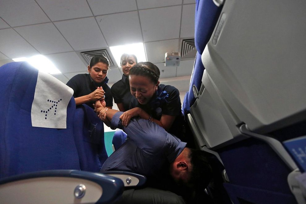 Tiếp viên hàng không của hãng Indi Go luyện tập xử lý tình huống trên máy bay.