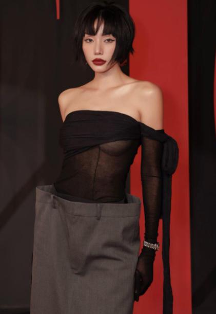 Trong hình, giọng ca "Nếu ngày ấy" diện mốt áo quây màu đen, chất liệu vải xuyên thấu phối cùng váy rộng và đi giày cao gót. Người đẹp hoàn thiện thêm vẻ ngoài của mình bằng chiếc găng tay màu đen dài, làm tăng vẻ bắt mắt cho tổng thể. Nữ ca sĩ để tóc ngắn, make up tông đỏ sắc sảo, cá tính, trông thu hút hơn.