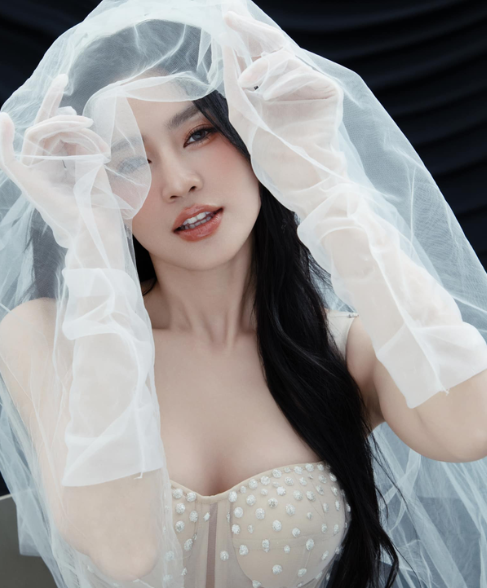 Trong loạt ảnh mới, nữ diễn viên diện chiếc váy trắng lộng lẫy, trên đầu đội khăn voan khoe visual xinh hết nấc.