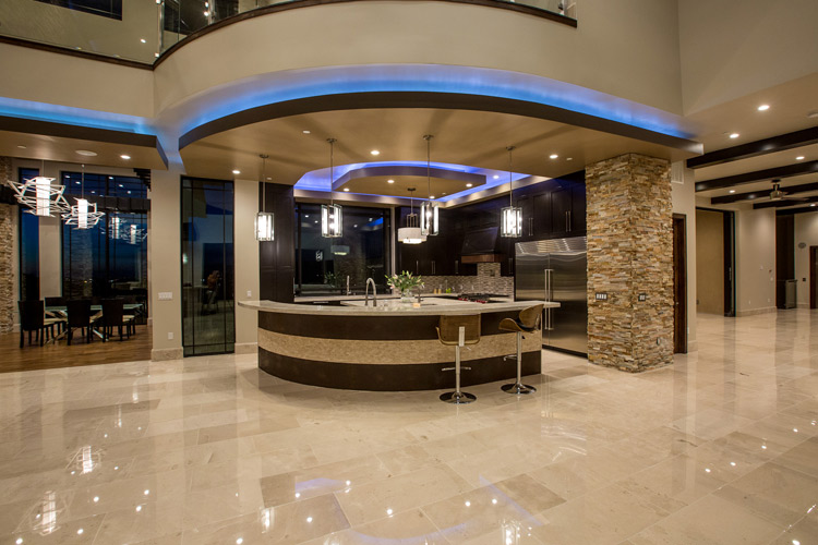 Các cột đá trong nhà được thiết kế tinh tế và hài hòa với bố cục chung. Từ phòng khách có thể nhìn thẳng tới không gian bar phía trong phòng bếp.