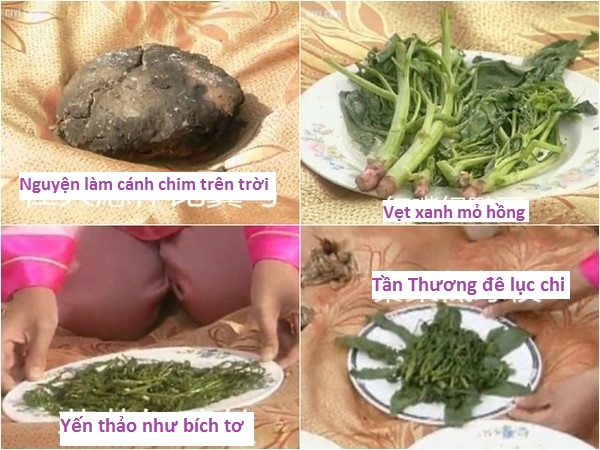 Trong khi món “Chim hoàng anh hót dưới cây mùa hạ” chỉ là đĩa trứng chiên vàng nhìn khá lôi thôi, bô nhếch. Ngoài ra món “Nguyện làm cánh chim trên trời” là một củ khoai lang nướng, Vẹ xanh mỏ hồng là đĩa rau xanh bày đơn điệu, kém thẩm mỹ, hay món Yến thảo như bích tơ và Tần Thương đê lục chi đều là những đĩa rau xào không hơn không kém.