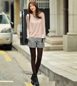 Đây là cách phối đồ ấn tượng nhưng sẽ đem lại hiệu quả bất ngờ với những cô nàng sở hữu đôi chân thon gọn. Chỉ cần trang bị quần tất và đôi bốt sành điệu, bạn vẫn có thể mặc quần soóc giữa mùa đông mà không lo bị lạnh.