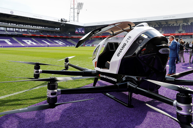 EHang 216 được sản xuất bởi EHang Air Mobility Group, một tập đoàn Trung Quốc. Xe được quảng cáo có thể bay với tốc độ 130 km/h, vận hành được trong vòng 40 phút. Theo nhà sản xuất, EHang 216 đã nhận được hàng nghìn đơn đặt hàng. Ảnh: CNBC.
